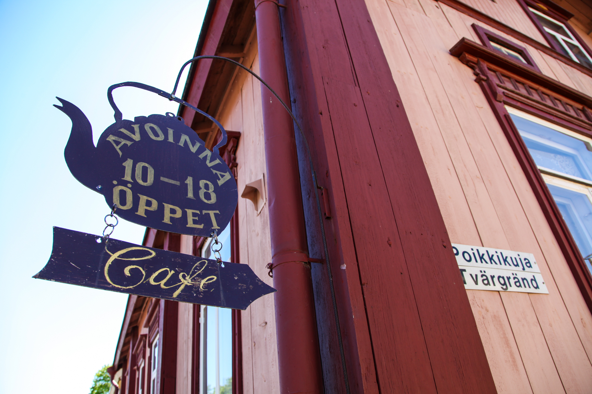 I kaféet som byggts i ett gammalt stall och på dess förtjusande innergård serveras hembakade läckerheter från valborg till höst kl. 10–18 alla dagar utom måndag. Medan du väntar på kaffe och kaka, tårta eller sunkki (salt munk) går tiden snabbt när du spelar lekfulla spel, klappar hunden, beundrar trädgården, solar eller småpratar.